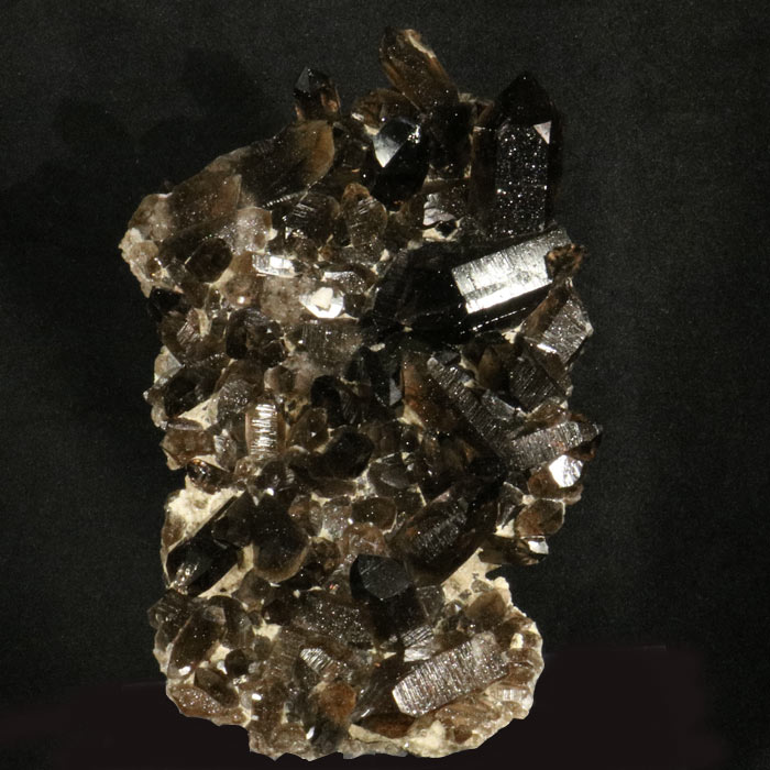Eine traumhafte Stufe mit glänzenden, im Auflicht pechschwarzen Morion-Kristallen bis etwa 3.5 cm Länge, welche sich mehr oder weniger flach an die Plattenform anschmiegen. Das Stück besteht nur aus Rauchquarz, weshalb bei Gegenlicht ein wunderbarer, durchscheinender Effekt entsteht. Das Stück ist vollkommen intakt und rundum auskristallisiert.