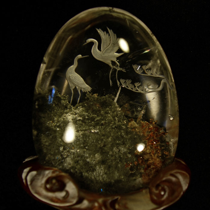 Beeindruckende Schleifkunst: In Phantomquarz (auch "Lodolith" genannt) eingravierte Kraniche und Baumäste. Durch diesen "3D-Effekt" entsteht eine wunderschöne Naturlandschaft.