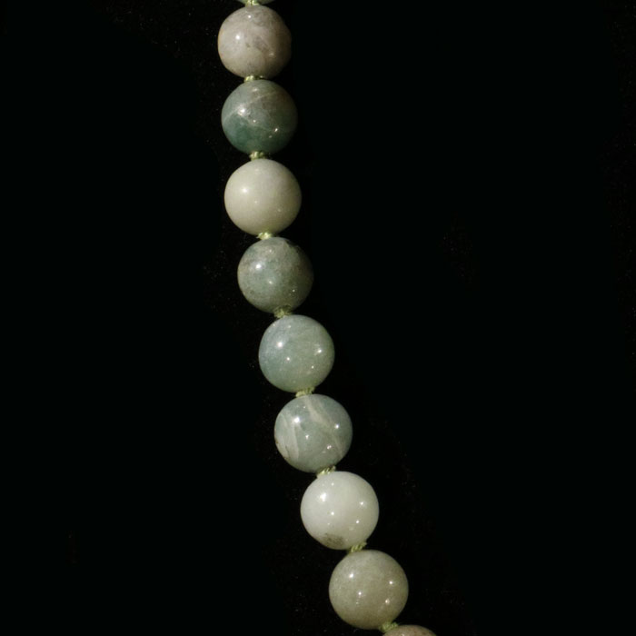 Geknüpfte Kette mit Kugeln (à 8 mm) aus Jadeit in verschiedensten Grüntönen. Sie ist ca. 46 cm lang und hat ein Schloss aus Silber.