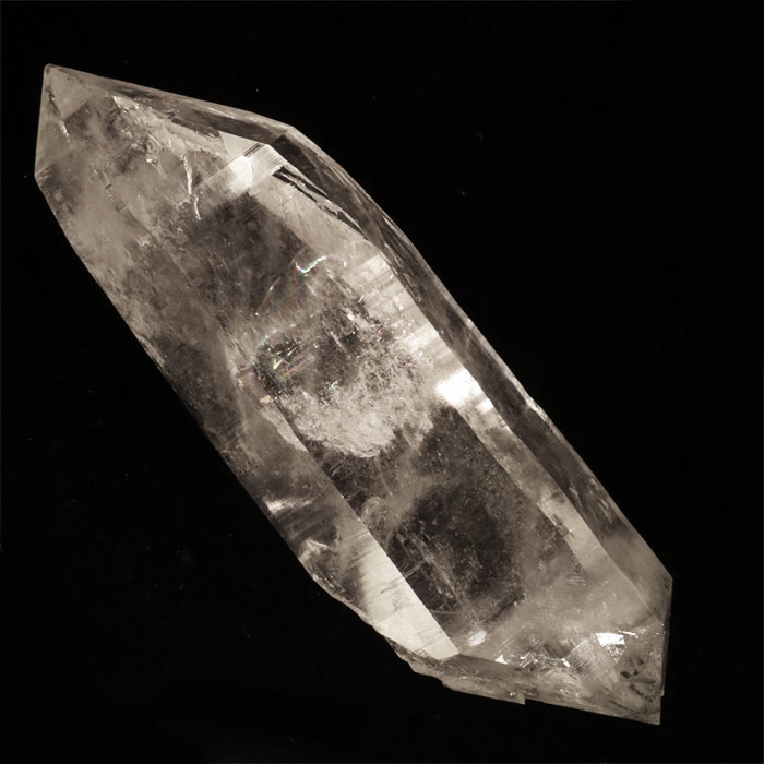 Ausgesprochen formschöner Bergkristall-Doppelender von Tessiner Habitus. Mit lokalen Chlorit-Einschlüssen und am (im Foto) rechten Ende wunderbar komplexen Kristallflächen.