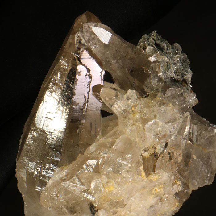 Helle Rauchquarz-Stufe mit Kristallen im Tessiner Habitus und einem dominanten Kristall wie aus dem Bilderbuch.