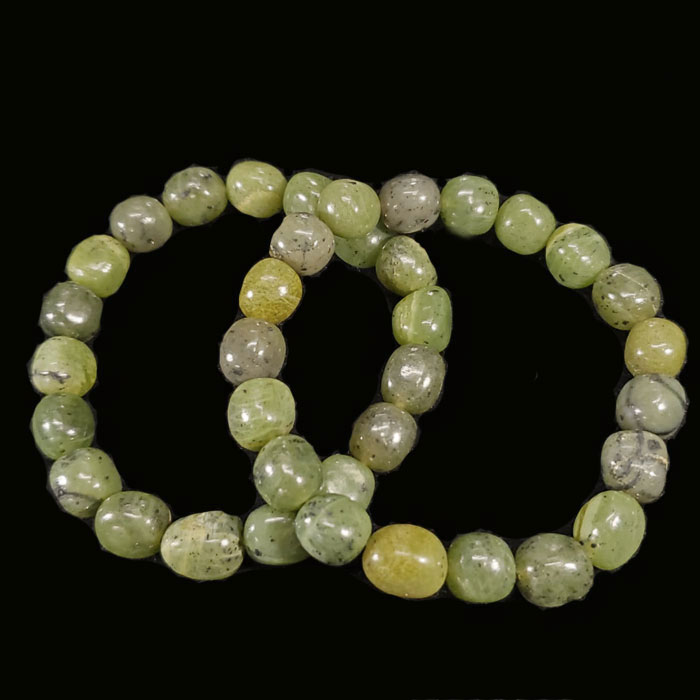 Schöne Nugget-Armbänder aus Serpentin. Die geschliffenen Steine sind ca. 8 mm im Durchmesser, bis 10 mm lang und auf stabilem Gummiband aufgezogen.