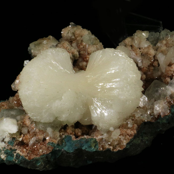 Ästhetisch hervorragende Stufe mit einer wunderbar ausgebildeten Desmin-Kristallgarbe (7.5x5 cm, beidseits schön aufgefächert), welche perfekt auf einem Stück Matrix mit klaren Apophyllit-Kristallen und ganz feinen rötlichen Heulandit-Kristallen sitzt.
