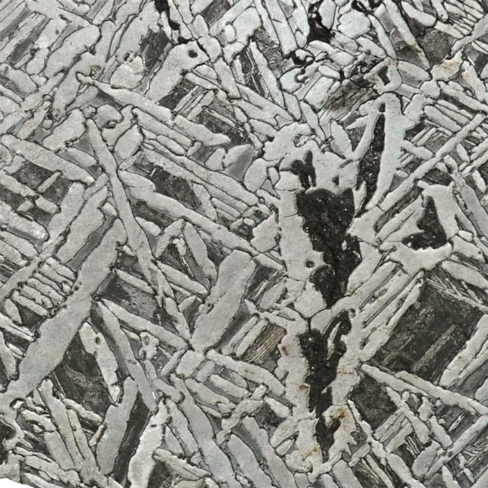 Grosse, museumswürdige Scheibe des Eisenmeteoriten von Seymchan aus dem Osten Russlands (entdeckt 1967) mit wunderbar ausgeprägten Widmannstättenschen Figuren. Die dunklen Einschlüsse sind Schreibersit und Chromit - typisch für Seymchan-Meteoriten.