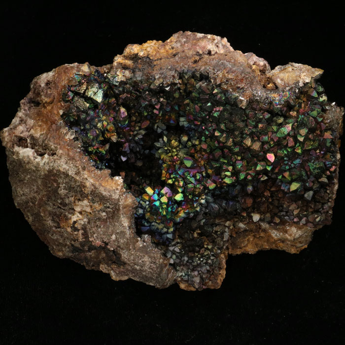 Das Wort "Regenbogen" wird bei so vielen Steinen verwendet - meist, um den Verkauf zu fördern - dass man es langsam Müde ist. Hier ist der Name aber absolut gerechtfertigt: dunkler Goethit, der intensiv regenbogenfarbig irisiert, auf Quarzkristallen in einer Druse. Ein spektakuläres Schaustück, von einem relativ neuen Fundort, der aber bereits aufgehört hat, zu liefern.
